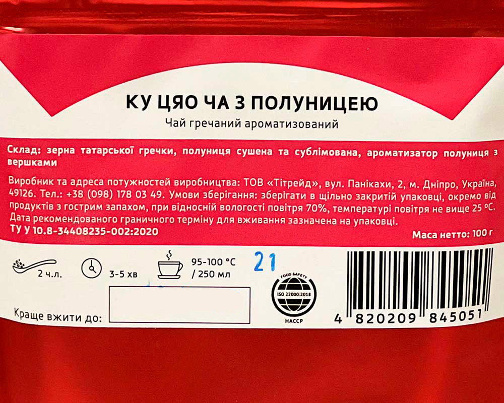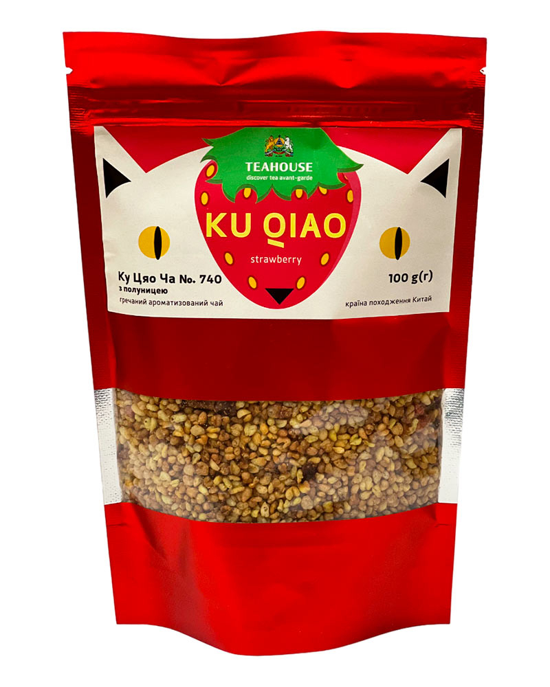 Чай "Teahouse" Гречишний Ку Цяо Ча з полуницею — це ароматний та корисний зерновий напій на основі світлої обсмаженої гречки з додаванням натуральної сушеної та сублімованої полуниці та ароматизатору "полуниця з вершками". Завдяки поєднанню теплої горіхово-зернової основи з м’якими ягідними нотками, цей чай має приємний смак і ніжний аромат, що навіює асоціації з літнім садом.