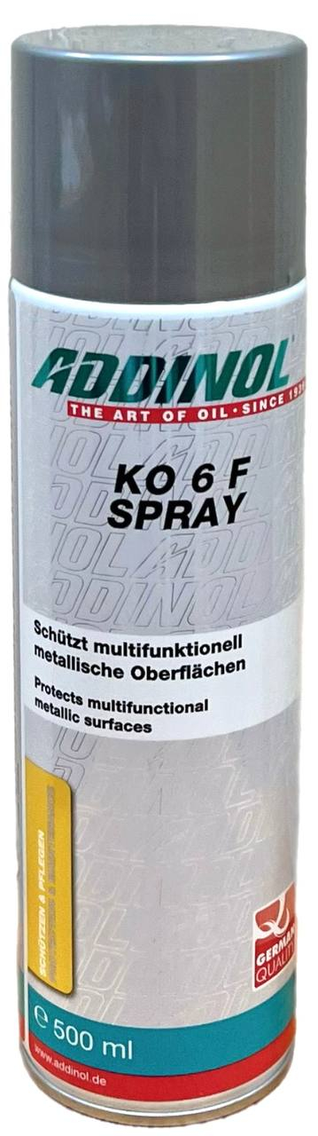ADDINOL KO 6-F Spray — це багатофункціональний антикорозійний засіб у формі аерозолю, що містить розчинник. Завдяки спеціальній формулі продукт витісняє воду, усуває потожирові сліди, розчиняє іржу та забезпечує мастильну дію. Ідеально підходить для тимчасового захисту металевих поверхонь.