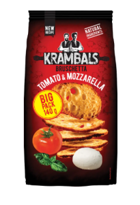 KRAMBALS Брускета Tomato & Mozzarella 140 г — це хрусткі італійські грінки, виготовлені з ароматного хліба та приправлені класичним поєднанням томатів і ніжного сиру моцарела. Вони мають насичений смак, легку солоність і приємну текстуру, що робить їх ідеальним снеком для перекусу, вечірки чи доповнення до вина та салатів.