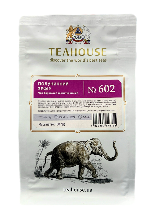 Чай Teahouse Полуничний зефір, 100 г – ароматизований листовий чай у герметичній упаковці. Має яскравий ягідний смак із нотами полуниці та ніжного зефіру. Завдяки герметичній упаковці зберігає свіжість та насичений аромат. Склад: яблуко сушене, каркаде, плоди шипшини, полуниця сушена, ароматизатор полуниця з вершками.