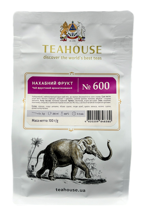 Чай Teahouse Нахабний фрукт, 100 г – ароматизований листовий чай у герметичній упаковці. Має яскравий фруктово-ягідний смак із тропічними нотами. Герметична упаковка зберігає свіжість та насичений аромат. Склад: каркаде, плоди шипшини, яблуко сушене, плоди аронії, цукати ананаса, малина сушена, аматизроатор малина.