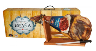 Продукт подається цілим шматком на кістці, що дозволяє нарізати його тонкими скибочками безпосередньо перед подачею, зберігаючи максимальну свіжість та аромат. Стильна подарункова упаковка робить хамон не лише гастрономічною окрасою святкового столу, а й престижним подарунком для поціновувачів вишуканих смаків.