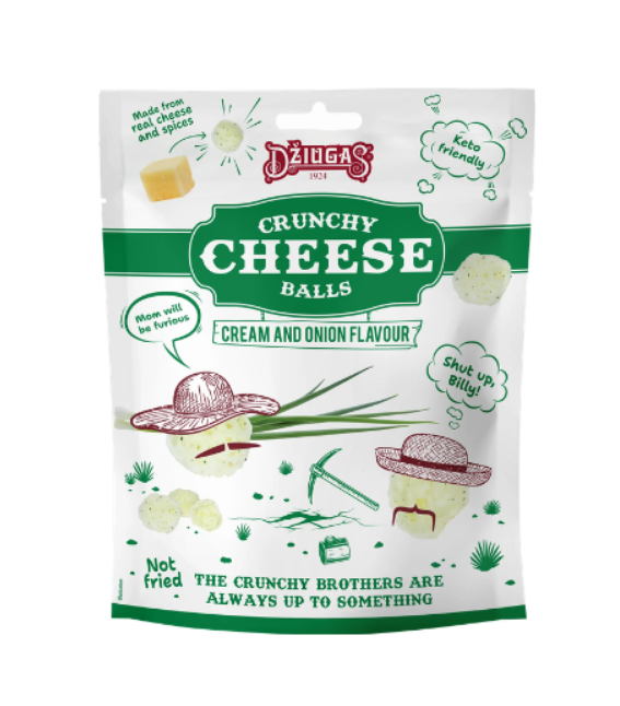 Хрусткі кульки із сухого твердого сиру Dziugas зі смаком вершків та цибулі — це вишуканий снек із насиченим смаком, який поєднує ніжність вершків та пікантність цибулі.