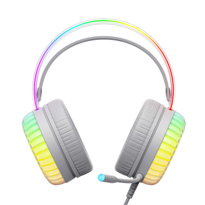 Всеспрямований мікрофон чітко передає голос, а RGB-підсвітка додає гарнітурі стильності. Ергономічне оголів’я легко регулюється під розмір голови, а м’які тканинні амбушури забезпечують комфорт навіть при тривалому використанні.