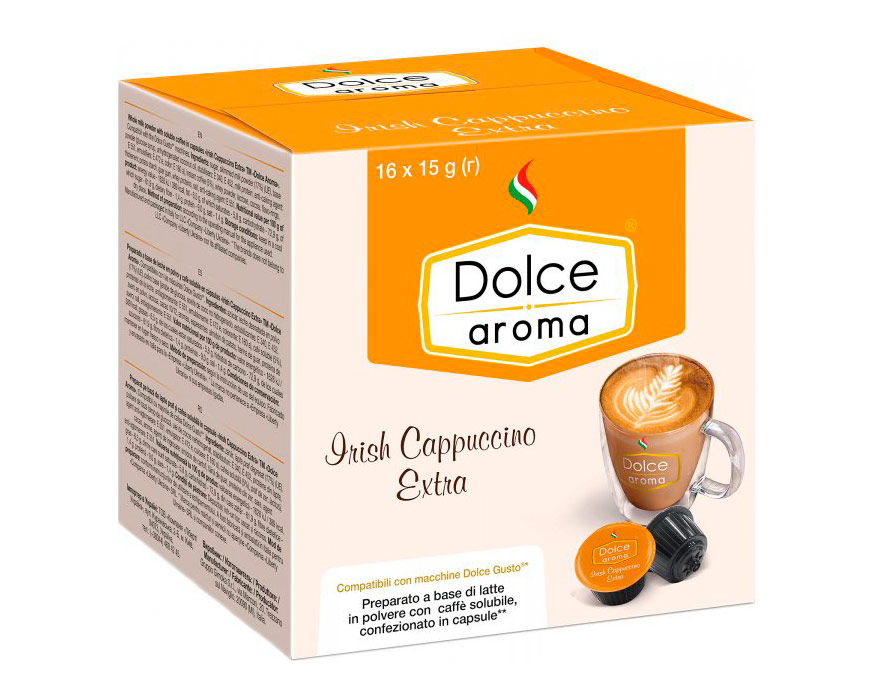 В упаковці — 16 капсул, сумісних з системами Dolce Gusto. Dolce Aroma Irish Cappuccino — це вишуканий смак, який дарує теплі емоції та задоволення з кожною чашкою.