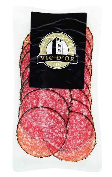 Ковбаса Салямі нарізка ТМ «Vic D’or», 80 г — це високоякісний м’ясний продукт у зручному форматі тонкої нарізки, готовий до споживання. Салямі виготовлена зі свинини та яловичини з додаванням натуральних спецій, що надають їй насичений пряний смак із легкою копченою ноткою. Завдяки вакуумній упаковці продукт зберігає свіжість, аромат і привабливий вигляд.