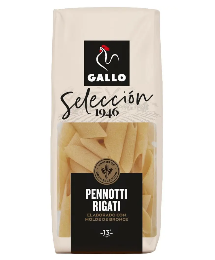 Макаронні вироби Gallo Seleccion 1946 Pennoti Rigati – це паста преміум-класу, виготовлена з добірної твердої пшениці. Вона має широку окружність і грубу терту поверхню, що дозволяє добре утримувати соуси, особливо м’ясні та овочеві.