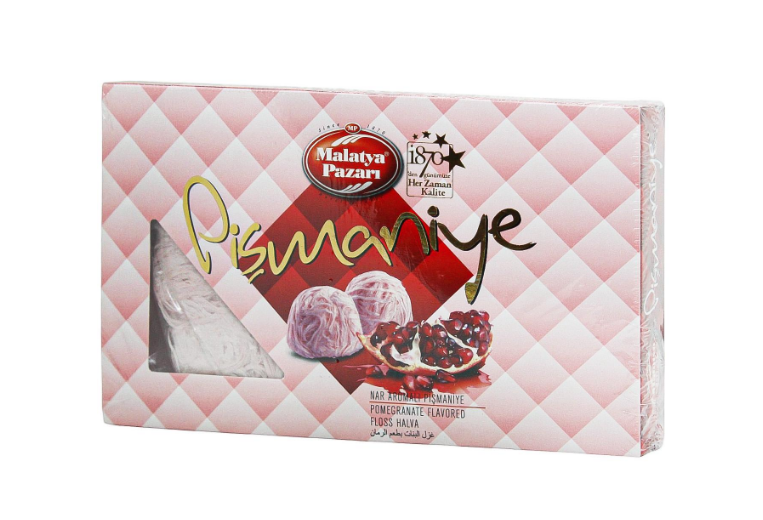 Malatya Pazari Пішманіє з гранатовим смаком, 240 г — це вишукана турецька солодкість, яка зовні нагадує солодку «вату», але має тонкі волокнисті шари, що тануть у роті. Завдяки додаванню натурального гранатового аромату, десерт отримує легку кислинку та витончений фруктовий післясмак, що додає йому особливого шарму.