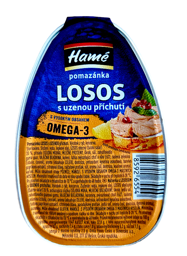 Hame Паштет з копченим лососем 100 г – це делікатесний рибний паштет, виготовлений із копченого лосося та натуральних інгредієнтів. Має ніжну текстуру, виразний рибний смак із характерним копченим ароматом, чудово намазується на хліб і підходить для приготування бутербродів чи закусок. Завдяки компактній алюмінієвій банці продукт зручно брати із собою в дорогу чи на пікнік. Особливістю паштету є те, що він є джерелом корисних омега‑3 жирних кислот, які підтримують здоров’я серця та судин.