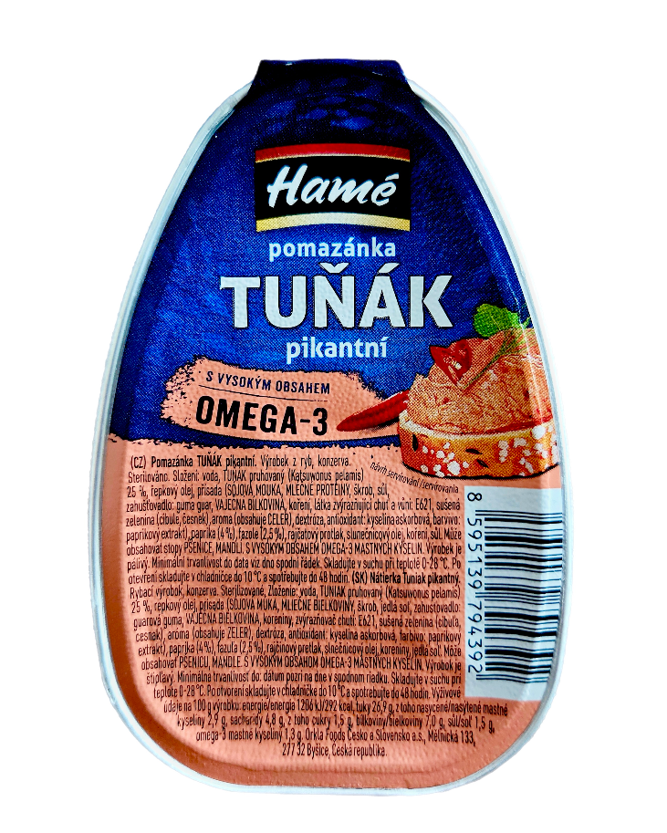Hame Паштет з тунцем пікантний 100 г – це ніжний рибний паштет із тунця з додаванням спецій, що надають йому виразного пікантного смаку. Має приємну текстуру, легко намазується на хліб і чудово підходить для приготування бутербродів чи закусок. Завдяки компактній алюмінієвій банці продукт зручно брати із собою в дорогу чи на пікнік. Особливістю паштету є те, що він є джерелом корисних омега‑3 жирних кислот, які підтримують здоров’я серця та судин.