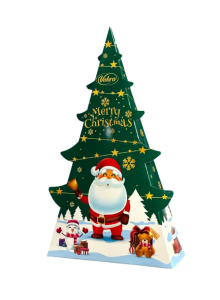 Цукерки оформлені у яскравій упаковці у формі різдвяної ялинки, що створює святкову атмосферу і робить набір чудовим подарунком до Різдва або Нового року.