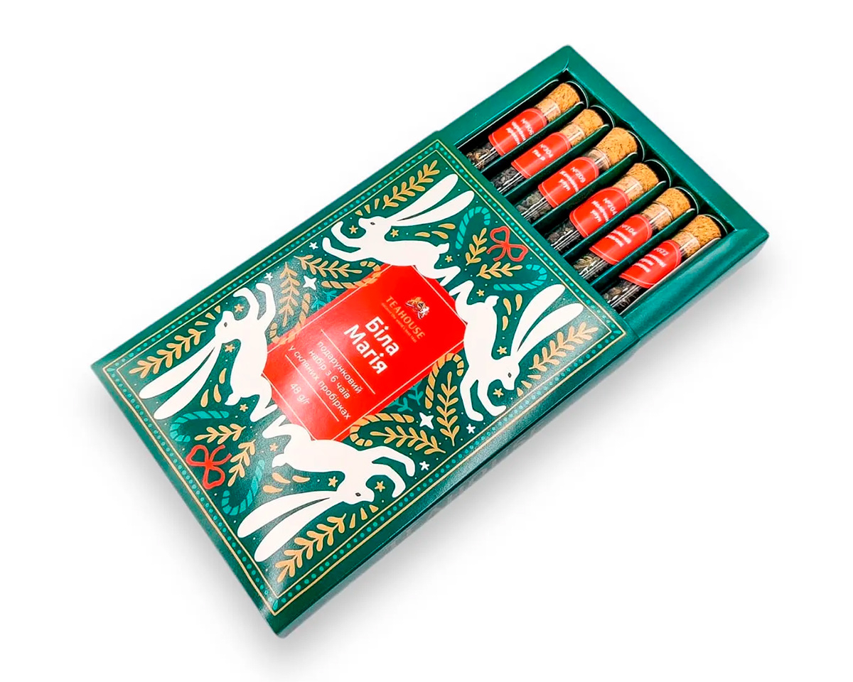 Подарунковий набір чаїв у скляних пробірках "Teahouse" Біла Магія - це витончений та символічний подарунок, що поєднує натуральність, красу та чайну естетику. У наборі — декілька різновидів чаю, які мають м’який, чистий смак і вишуканий аромат, а також сприяють релаксації, легкому тонусу та гармонії.