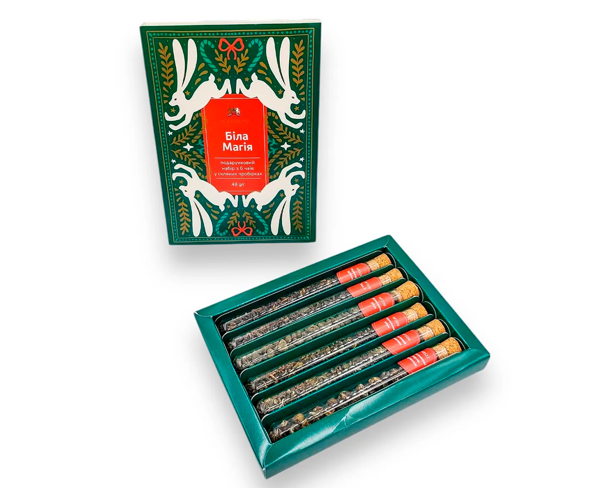 Кожна скляна пробірка — це окремий чайний настрій. Елегантна упаковка з акцентом на світлі, прозорість і природність робить "Білу Магію" чудовим подарунком на особливі події або жестом турботи для близьких.