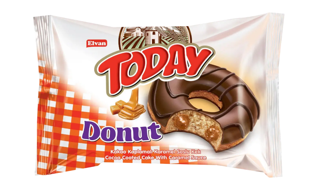 Пончик “TODAY” зі смаком карамелі, 50 г — це ніжний бісквітний десерт від турецького виробника Elvan, з ароматною карамельною кремовою начинкою. М’яке повітряне тісто у поєднанні з насиченим солодким карамельним смаком створює приємний баланс смаку, роблячи пончик ідеальним перекусом або доповненням до чаю, кави чи молока.