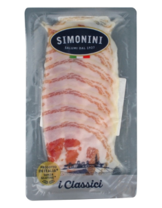 Нарізка вагою 80 г ідеально підходить для швидкого сервірування. Вакуумна упаковка зберігає свіжість і всі смакові якості. Simonini — бренд із глибокими традиціями італійського м’ясного ремесла.