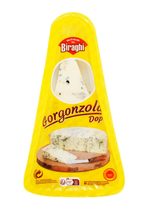 Горгонзола DOP – це знаменитий італійський блакитний сир із захищеним найменуванням походження (Denominazione di Origine Protetta). Виробник Biraghi гарантує автентичний смак та високу якість продукту.