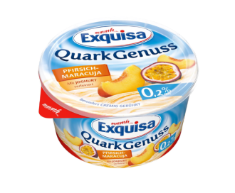 Сирний десерт TM Exquisa зі смаком персика та маракуї — це поєднання легкості, ніжної текстури та яскравого тропічного смаку. Завдяки низькому вмісту жиру (всього 0.2%) продукт ідеально підходить для тих, хто піклується про своє харчування, не жертвуючи при цьому насолодою від їжі. Його основа — натуральний м’який сир, доповнений соковитим пюре з персика та екзотичної маракуї, що створює гармонійний і свіжий смаковий баланс.