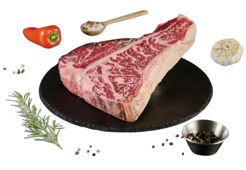 Портер-Хаус стейк, сухої витримки, — це величезний та соковитий стейк, який включає в себе частини вирізки і антрекоту. Це ідеальний вибір для тих, хто хоче відчути різноманітність смаків у одній страві.
