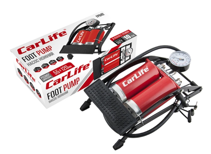 Ножной насос Carlife 55 мм × 120 мм, двухцилиндровый с манометром и дополнительными адаптерами, 10 Атм — это надёжный и компактный инструмент для накачивания автомобильных, велосипедных и мотоциклетных шин, а также других изделий, требующих давления. Благодаря двухцилиндровой конструкции обеспечивается быстрое и эффективное нагнетание воздуха. Встроенный манометр позволяет точно контролировать давление до 10 Атм, а дополнительные адаптеры делают насос универсальным для разных типов вентилей.