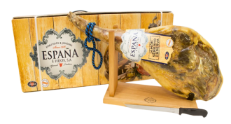 Продукт представлен целым куском на кости, что позволяет нарезать его тонкими ломтиками непосредственно перед подачей, сохраняя свежесть и богатый аромат. Элегантная подарочная упаковка делает хамон не только гастрономическим украшением праздничного стола, но и престижным подарком для ценителей изысканных вкусов.
