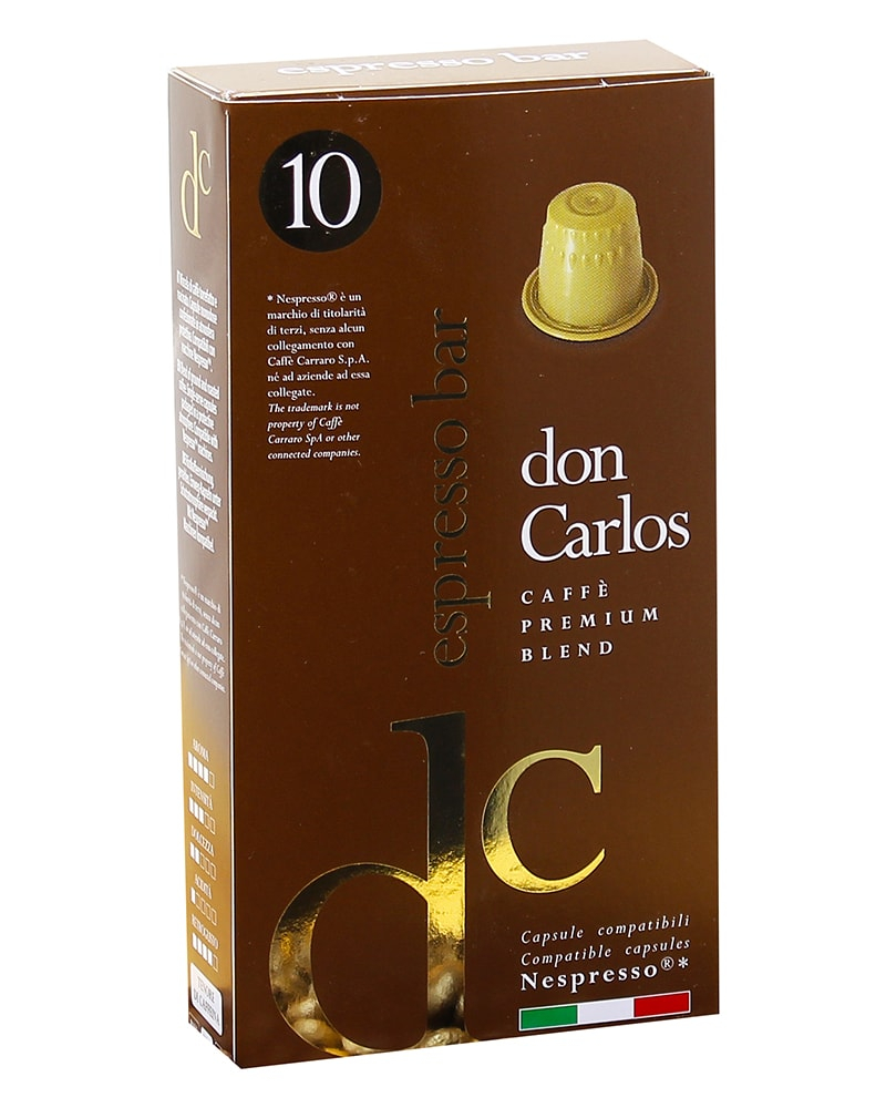 Заваренный кофе в капсулах Carraro Don Carlos Espresso Bar имеет умеренную горчинку с низкой кислотностью, выраженный аромат и длительное послевкусие с нотками какао.Капсулы Carraro Don Carlos Espresso Bar совместимы с кофемашинами с системой NESPRESSO для домашнего использования.