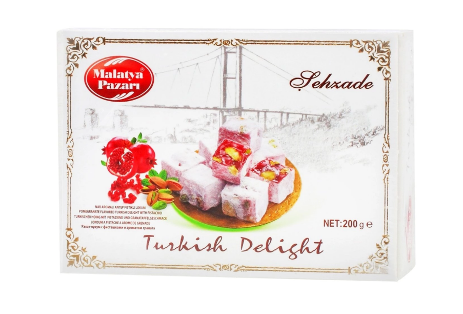 Malatya Pazari Рахат-лукум гранатовый с фисташкой Шехзаде, 200 г — это изысканное воплощение восточной сладости с современным акцентом. Гранатовый вкус придаёт свежесть и лёгкую фруктовую кислинку, а фисташки добавляют благородный ореховый оттенок и приятную хрустящую текстуру.